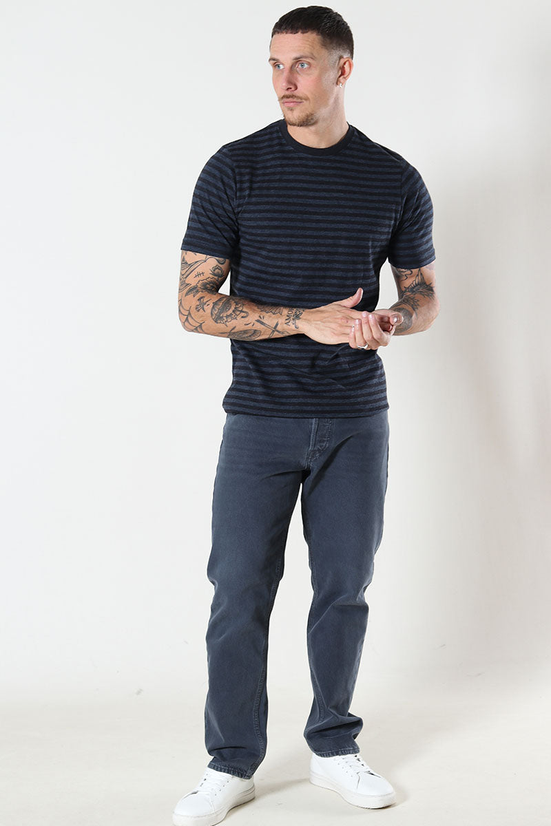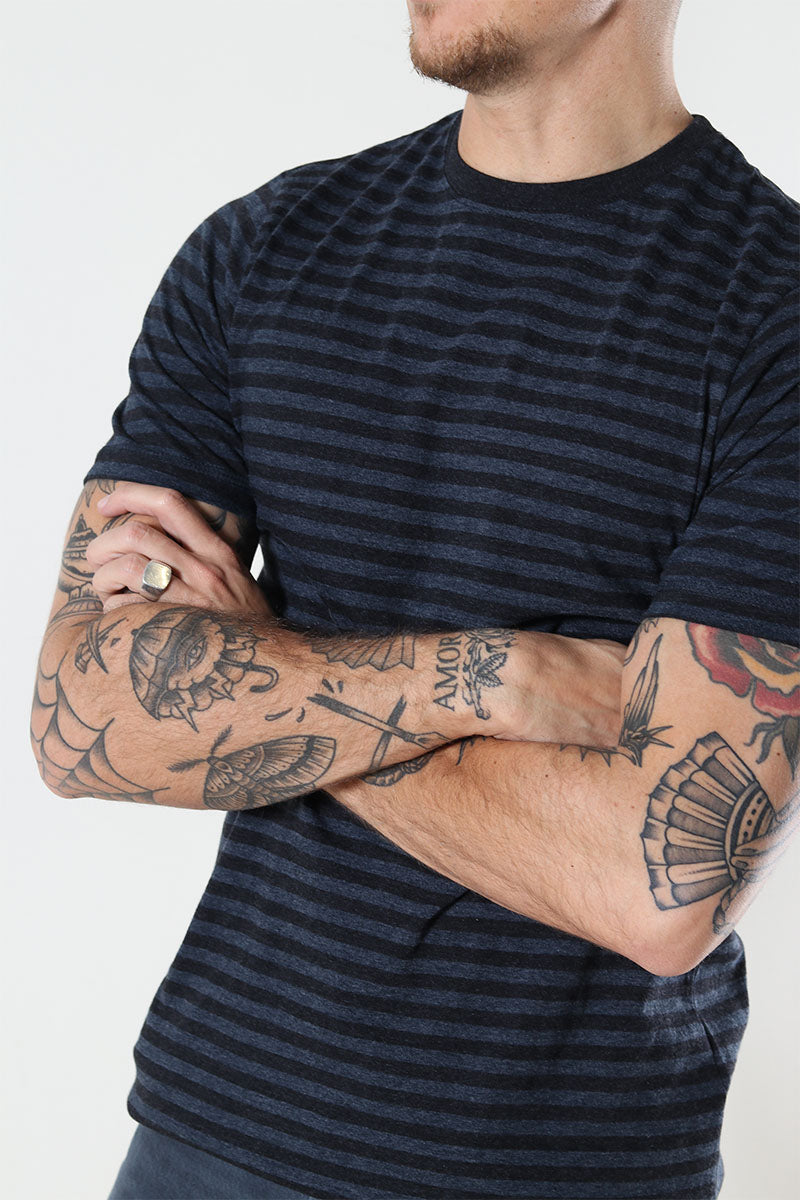 T-shirt van Basic Brand. in een meleret zwarte en meleret donkerblauwe strepen daarbij.O-neck kraag. Kwaliteit: 80% katoen, 20% polyester.