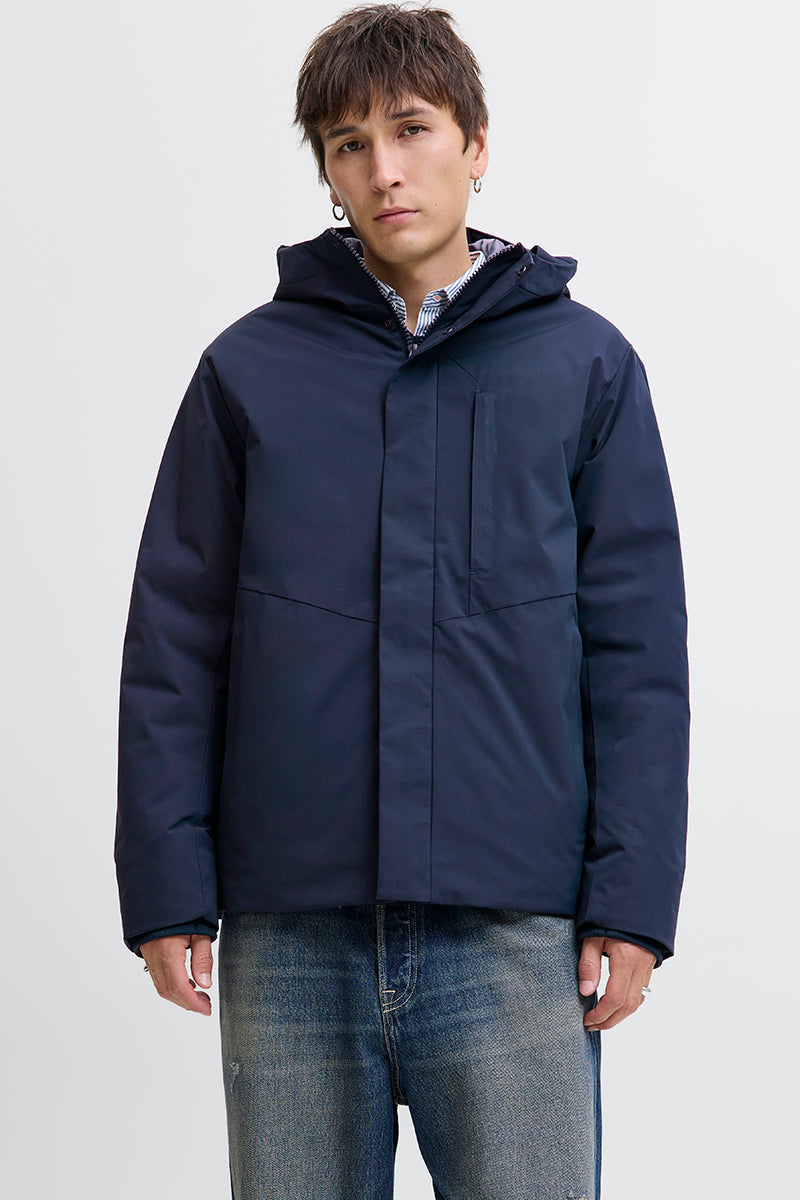 - De jas heeft 2 schuine voorzakken en een borstzak. De jas is wind- en waterafstotend