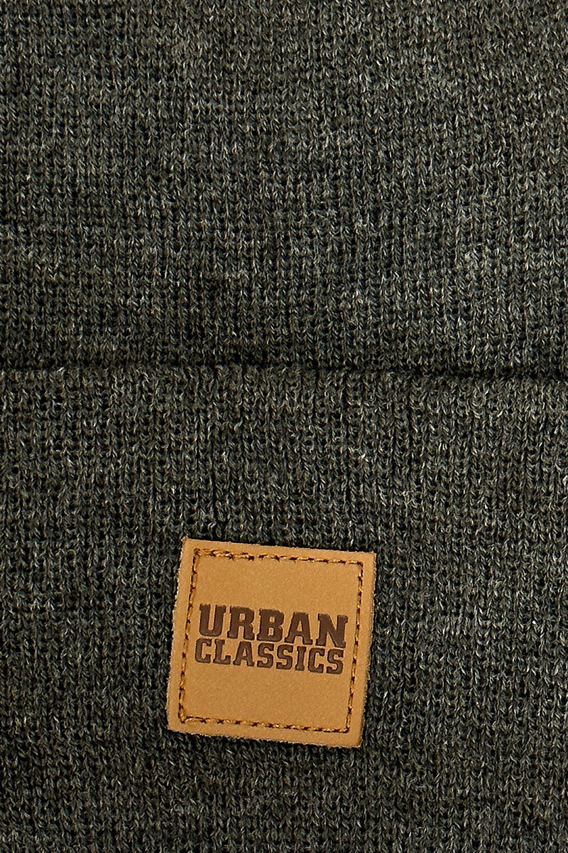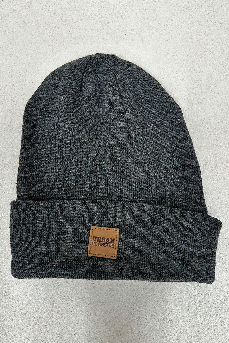 Donker grijzen Urban Classics gebreide muts, met een leren Urban Classics logo op de voorkant. Kwaliteit; : 100% Acryl.