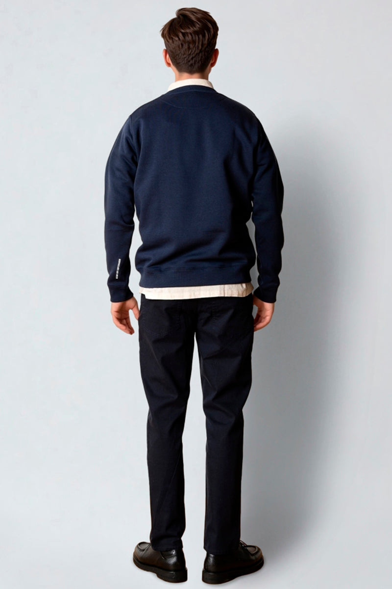 - De trui heeft ribboorden bij de mouwen en zoom en een klein logo op de borst