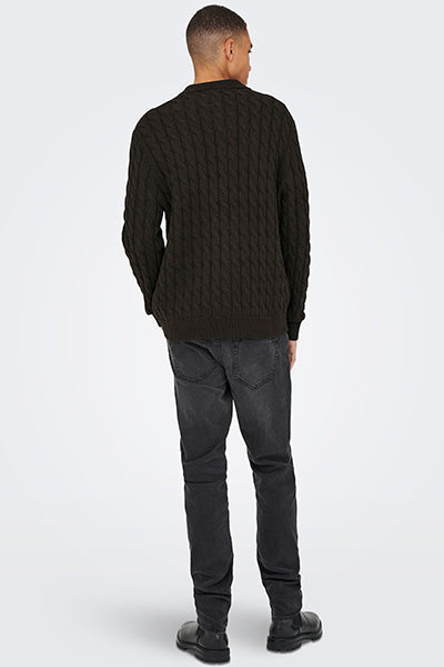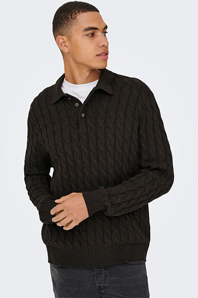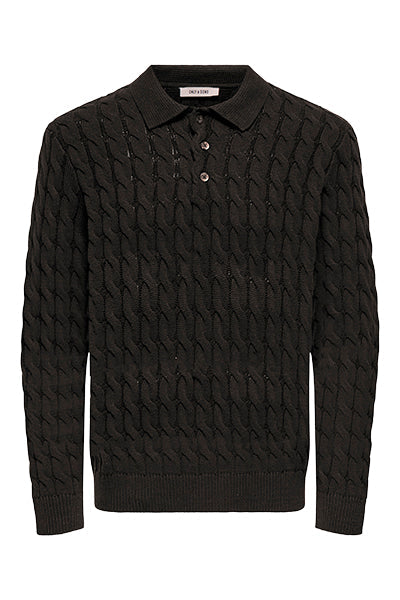 - De trui heeft een gebreide kraag en 3 knopen bovenaan. Hij heeft ook ribboord aan zoom en mouwen