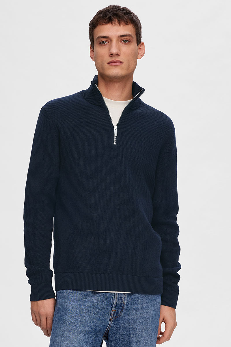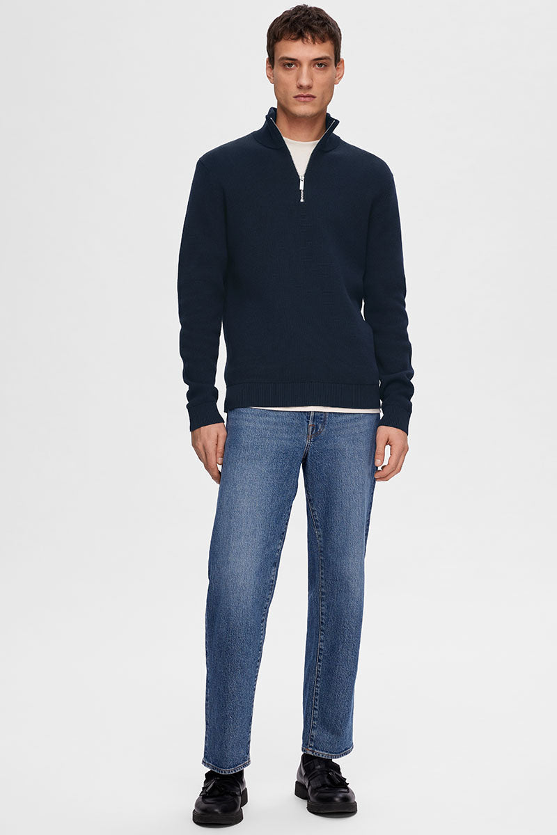- Donkerblauwe gebreide trui met lange mouwen in regular fit