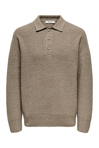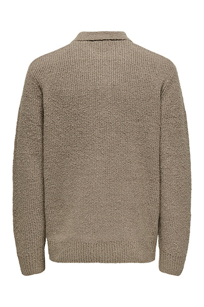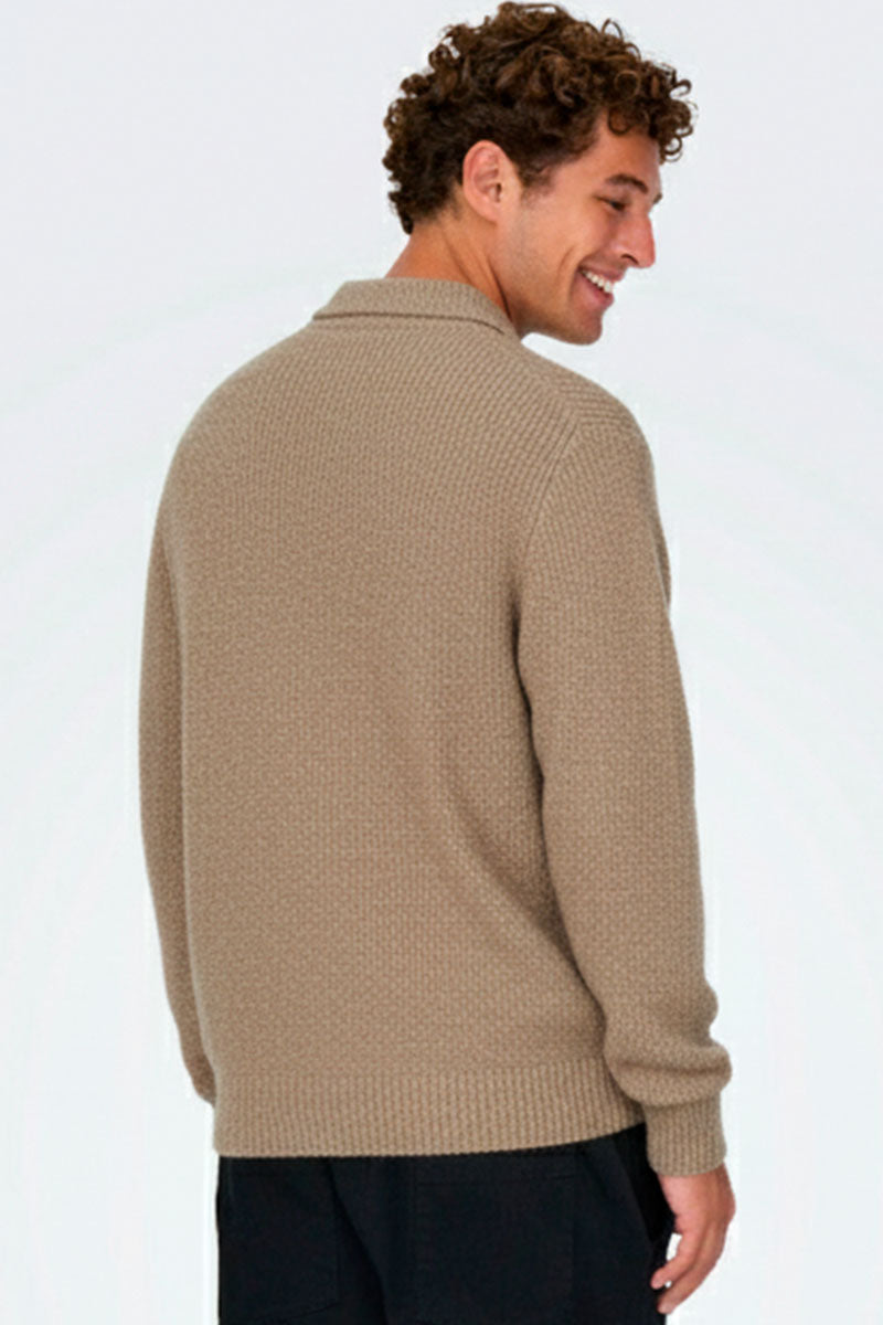 - De trui heeft een gebreide kraag en 3 knopen bovenaan. Daarnaast heeft hij ribboord aan zoom en mouwen