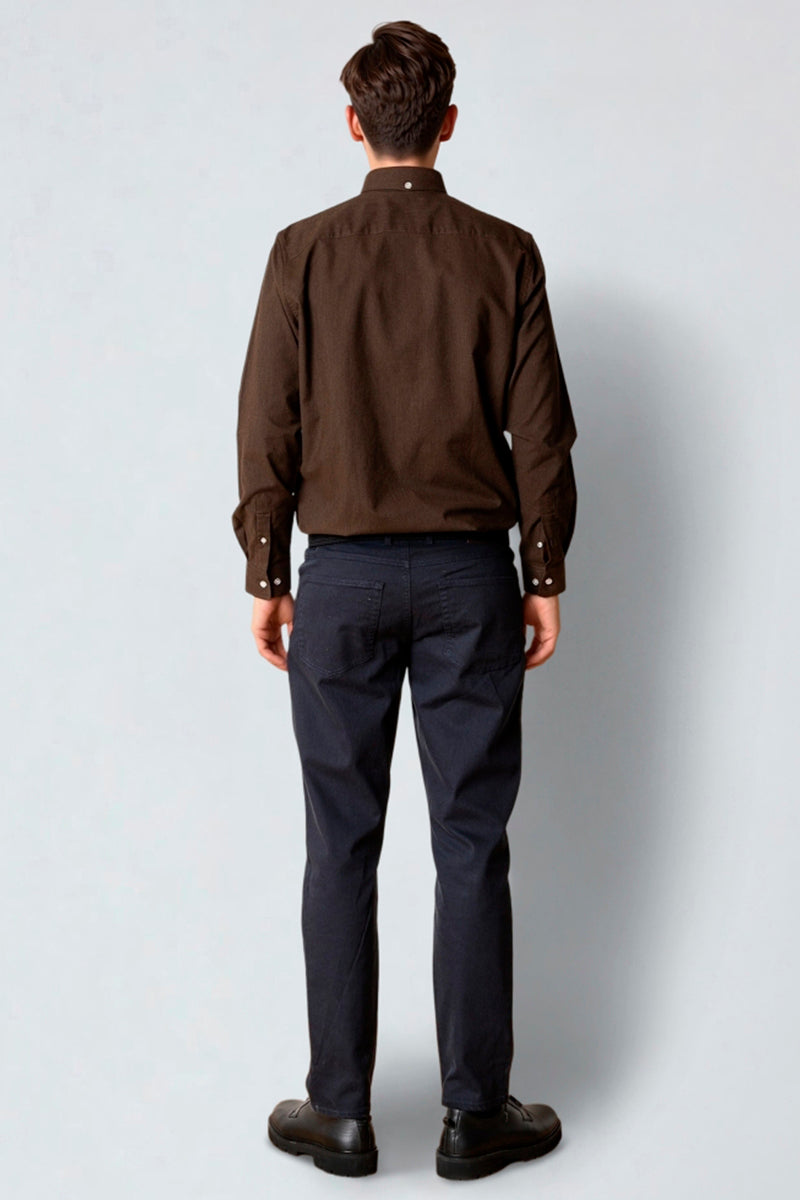 - Het overhemd heeft een button-down kraag en een ronde zoom.