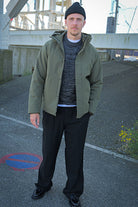 - Uni gekleurde jas met capuchon.