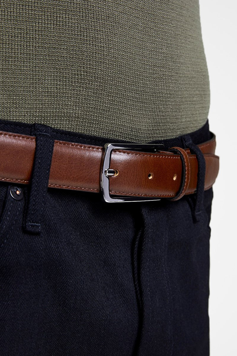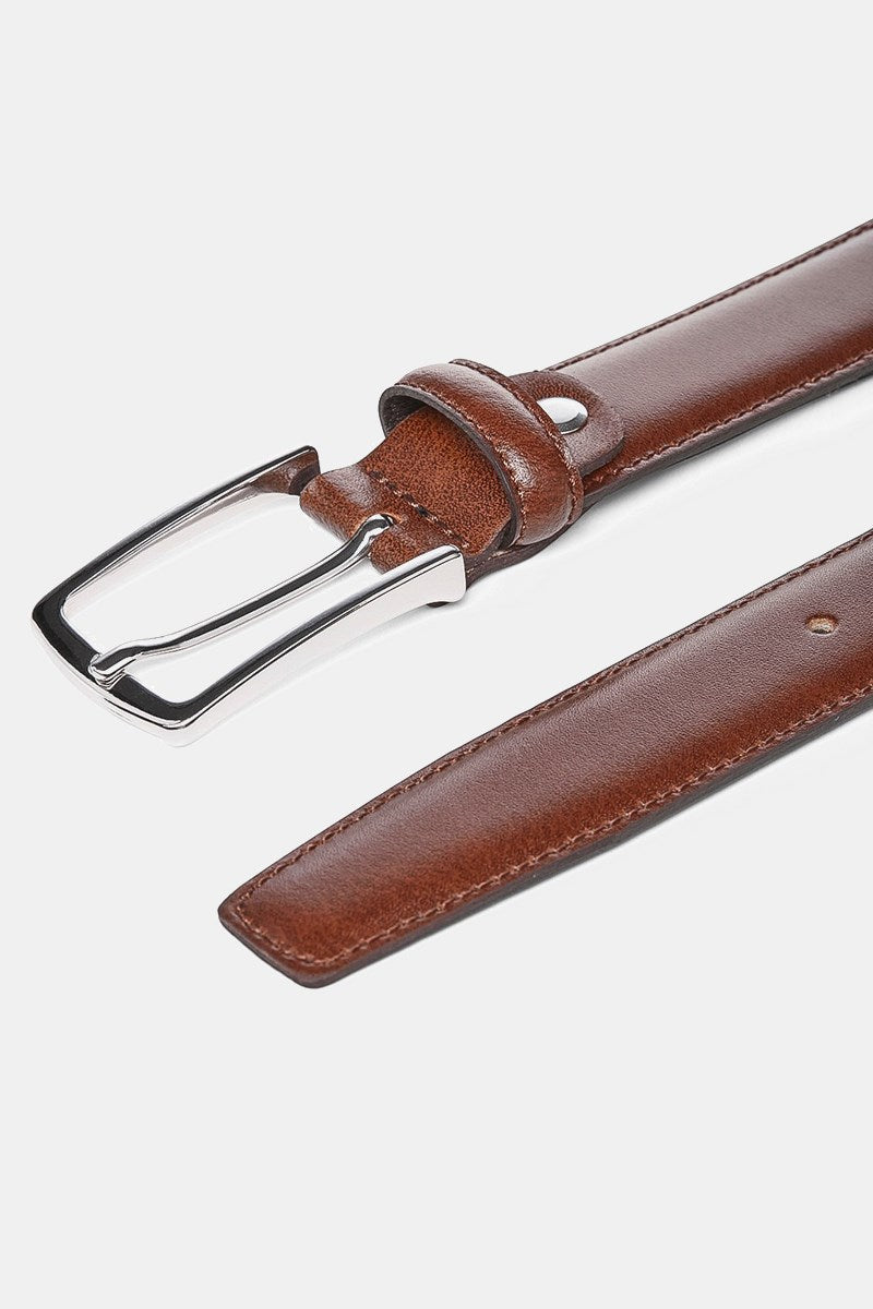 Deze riem in cognackleur is gemaakt van soepel, gecoat leer dat van nature waterafstotend en duurzaam is, waardoor het een investering is die jaren meegaat. Met een pin gesp sluiting biedt hij een klassieke en verzorgde uitstraling, perfect om je professionele of feestelijke outfit compleet te maken met tijdloze accessoires. De breedte van 3 cm zorgt voor een subtiele maar sterke toevoeging aan je look.