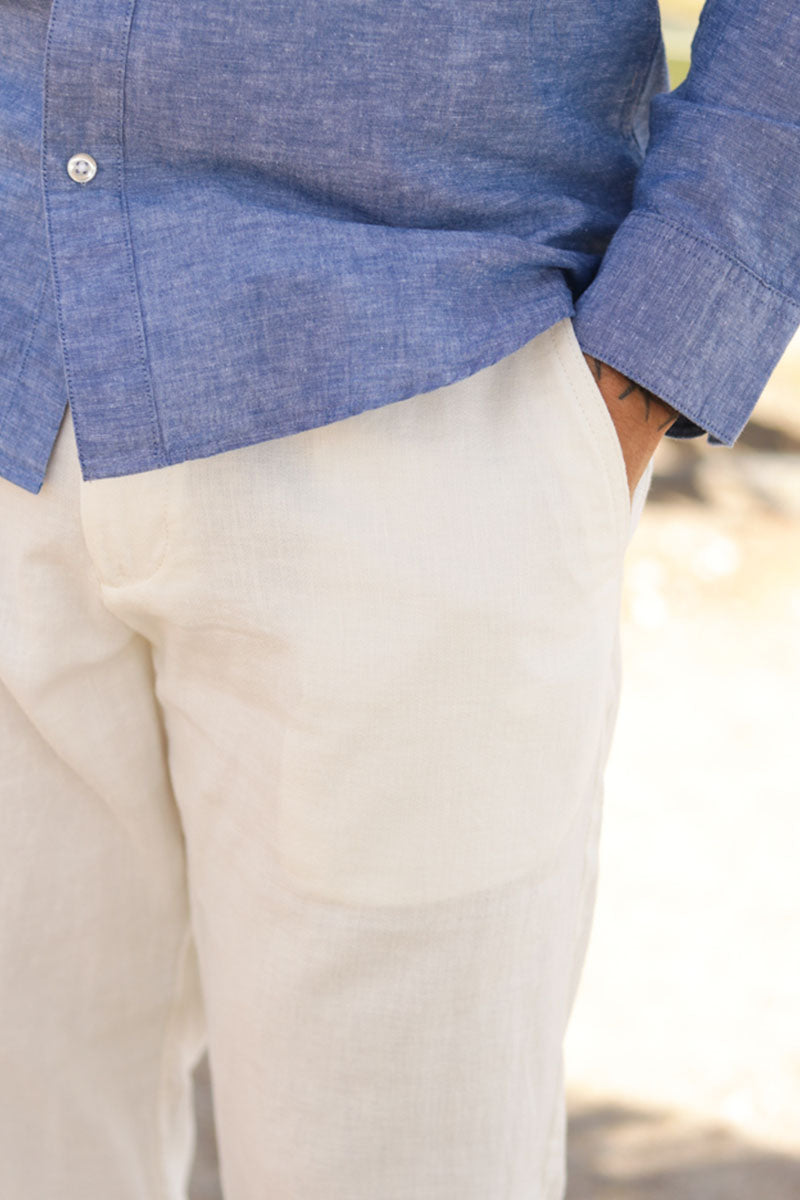 Deze slim tapered fit chino is perfect voor een casual en comfortabele look. De broek heeft een mid-rise taille en sluit met een knoop en rits. Door de combinatie van biologisch katoen, linnen en een klein beetje elastaan voelt de stof zowel zacht als ademend aan, waardoor hij een fijne keuze is voor het voorjaar. De lichte kleur Cloud Dancer geeft de broek een frisse en tijdloze uitstraling.
