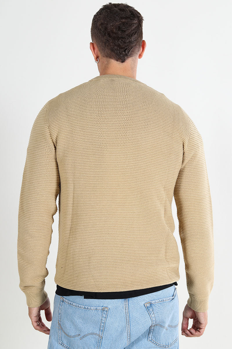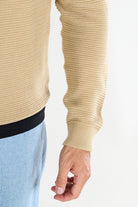 - De trui heeft geribde boorden aan de onderkant, de mouwen en de hals.