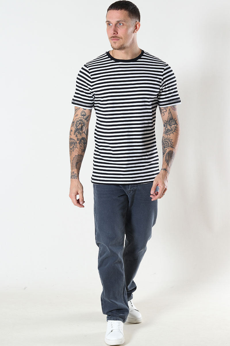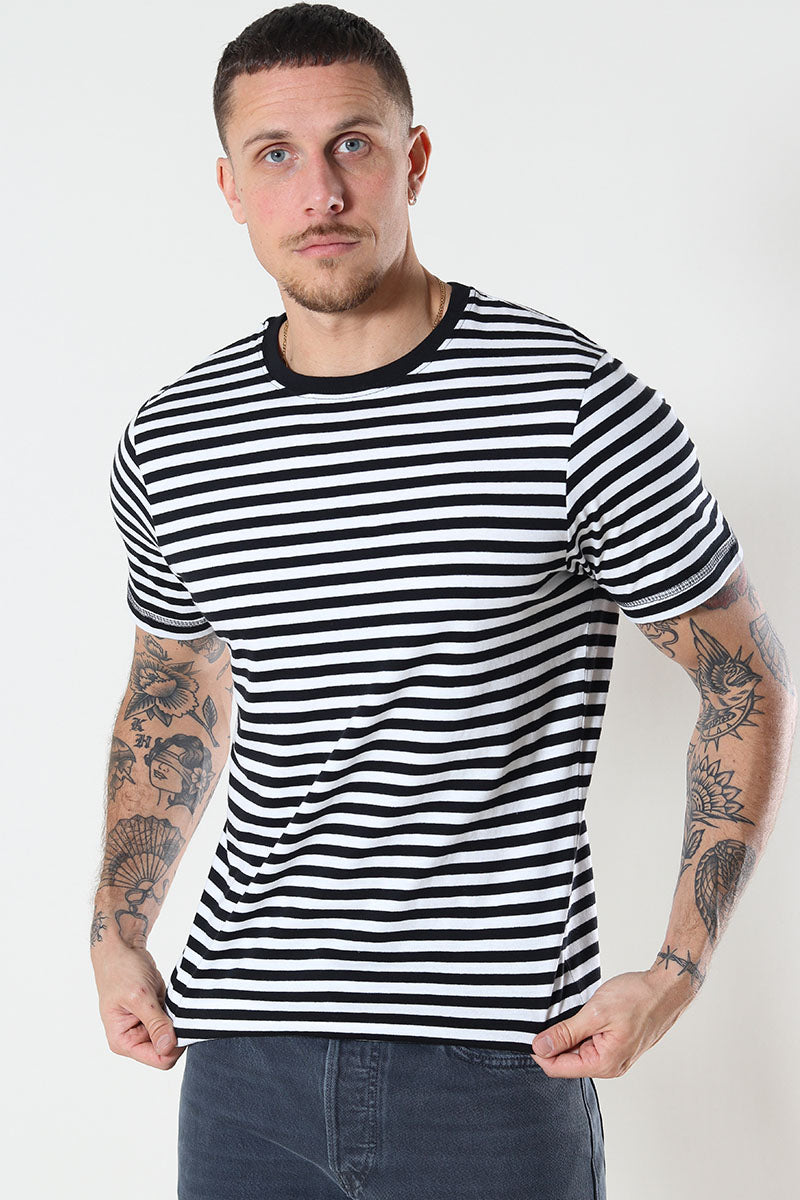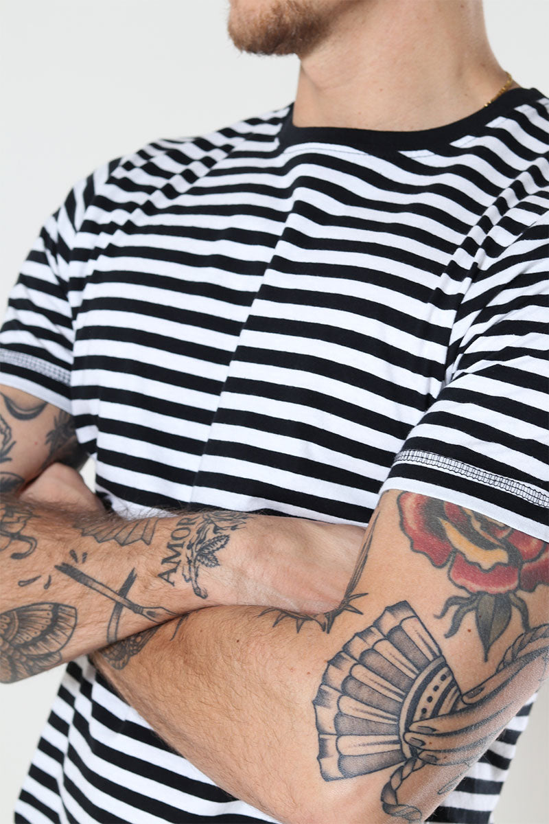 T-shirt van Basic Brand in een zwarte en witte gestreepte kleur en gemaakt van een een zachte materiaal. Kwaliteit: 85% katoen, 15% viscose.