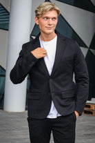 Deze slim fit blazer is perfect voor een stijlvolle en nette uitstraling bij verschillende gelegenheden. De blazer heeft een reverse halslijn en combineert comfort met een moderne pasvorm. Dankzij het gebruik van viscose, gerecycled polyester en elastaan zit het kledingstuk prettig en heeft het een lichte stretch voor extra bewegingsvrijheid. De zwarte kleur maakt het een veelzijdige keuze die gemakkelijk te combineren is.