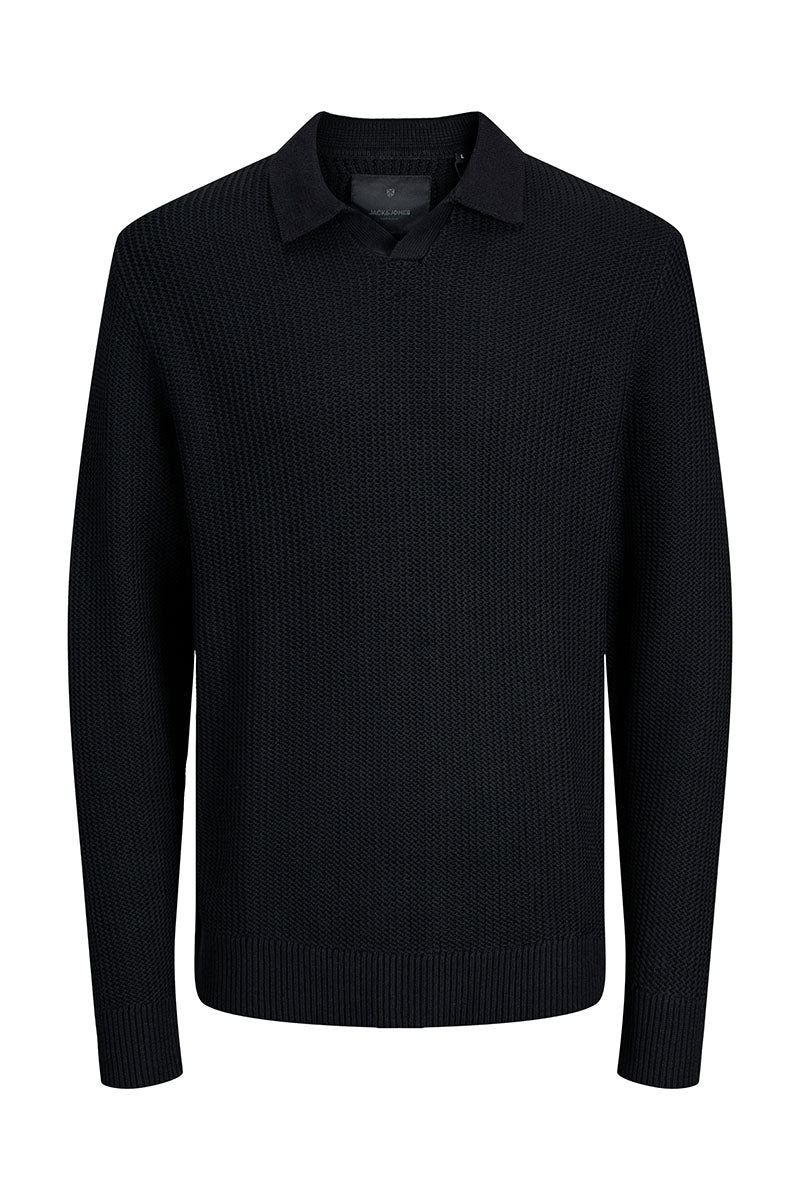 • Heeft een polokraag en geribde boorden aan de mouwen en zoom