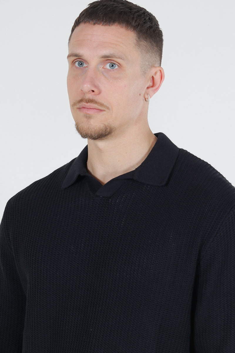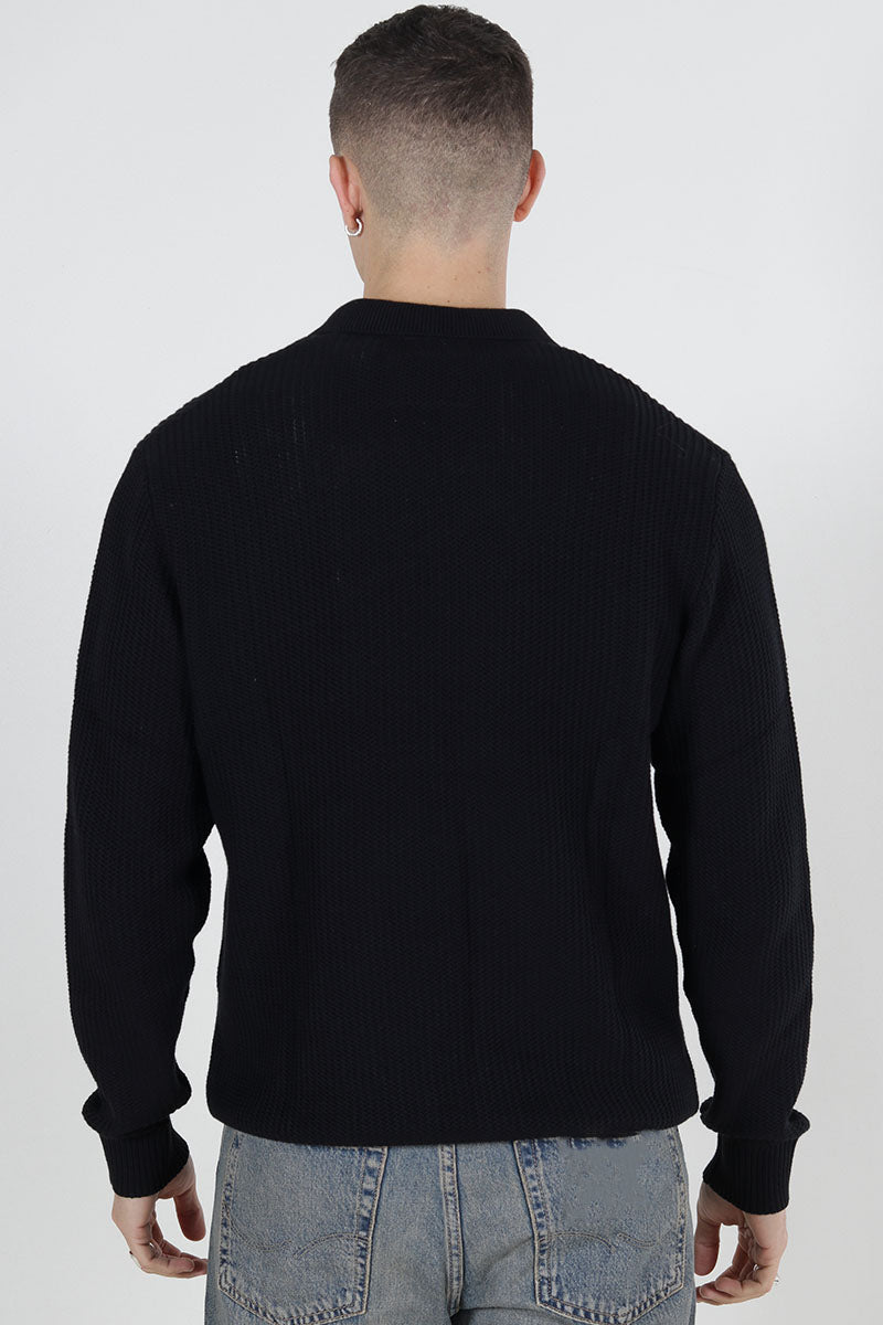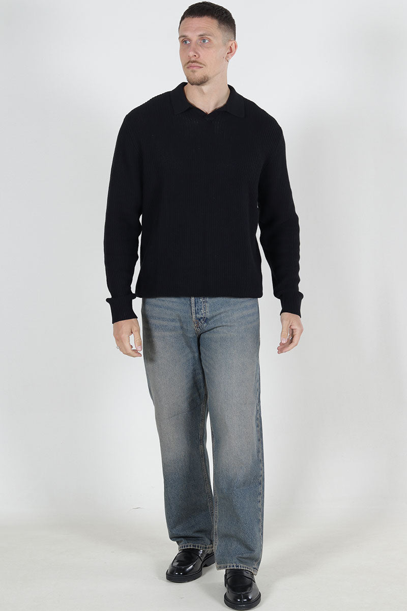 - Heeft een polokraag en geribde boorden aan de mouwen en zoom