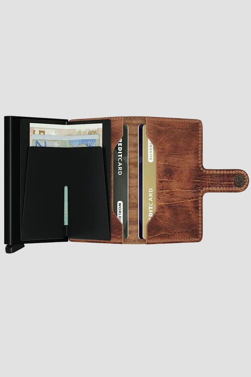 - De kaarthouder beschermt tegen slijtage en RFID‑scanning. Hij is gemaakt van aluminium en bekleed met vintage leer, wat een exclusieve uitstraling geeft.